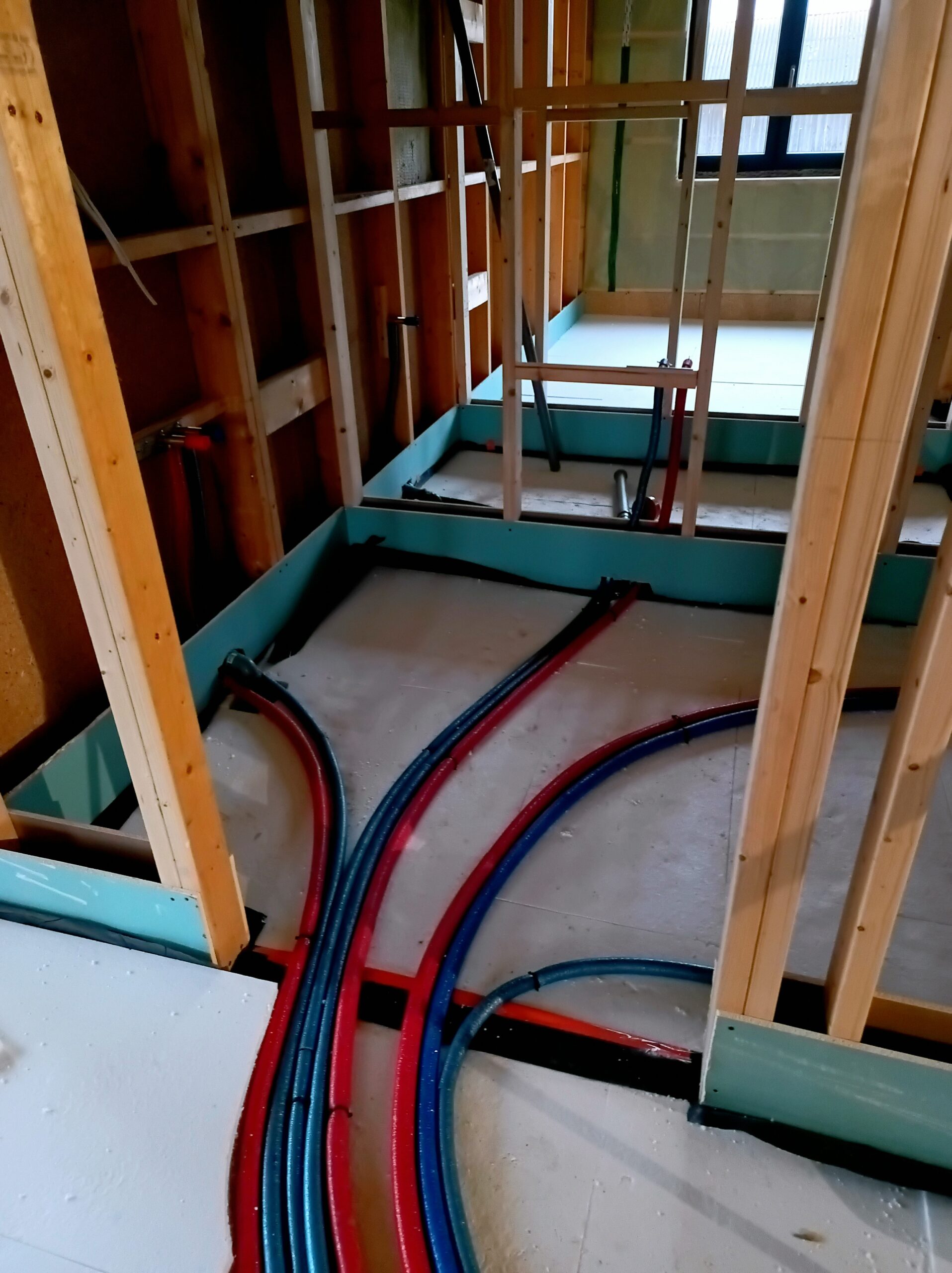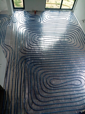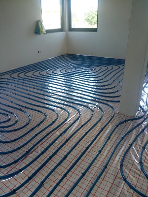Jest to obecnie najlepszy sposób rozprowadzenia ciepła po budynku. W zdecydowanej większości domów obecnie montuje się w 100% ogrzewanie podłogowe, grzejniki jeśli występują to tylko w łazienkach. Ciepło z podłogi jest bardzo wygodne i przyjemne, ma zdecydowanie więcej zalet niż grzejniki. Wykonując ogrzewanie podłogowe stosujemy system producenta Kan Therm Blue Floor, elementami jego są: